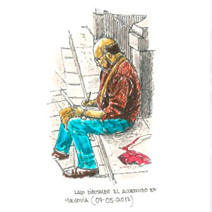 Juan Gonzalo Miguel Martínez, Lalo, es un dibujante ocasional de ballenas, porque en alguna ocasión fue a ver cetáceos, pero su vocación por el dibujo y la Naturaleza no es ni mucho menos ocasional, es sin duda de toda y para toda la vida. Su implicación en reivindicaciones y trabajos dirigidos a la protección y puesta en valor de la Naturaleza, de la cultura rural y del patrimonio cultural, le preceden desde hace décadas. Es el dibujante a vuelapluma que toda expedición naturalista quisiera tener. Así lo hacía y lo sigue haciendo, cuando estando en el campo desparece, está ahí, detrás de un arbusto, sentado en un pedrusco, lapicero o boli en mano, trazando sus apuntes rápidos que luego termina y convierte en obras de arte realizadas con tinta china y rotuladores indelebles, tal y como podemos ver en este autorretrato y en su blog, porque todo lo comparte.